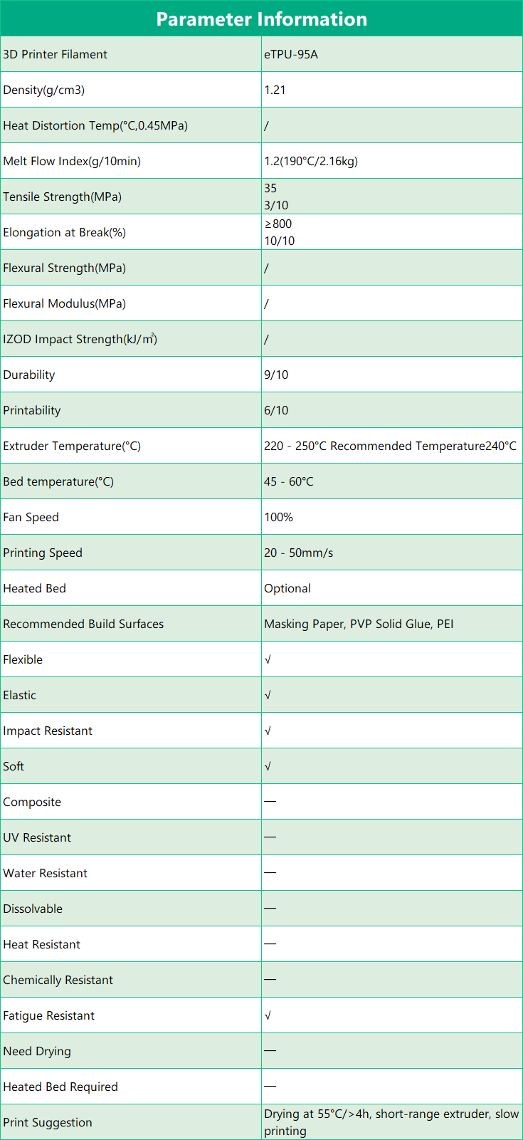 TPU 95A filament, 3D baskıda genellikle düşük sıcaklıklarda (genellikle 200-220°C arası) eritilir ve istenilen şekilde katman katman birleştirilerek nesneler oluşturulur. Esnekliği nedeniyle, TPU filament genellikle sıkı filament besleme sistemlerine ve uygun ısıtma tablalarına ihtiyaç duyar.